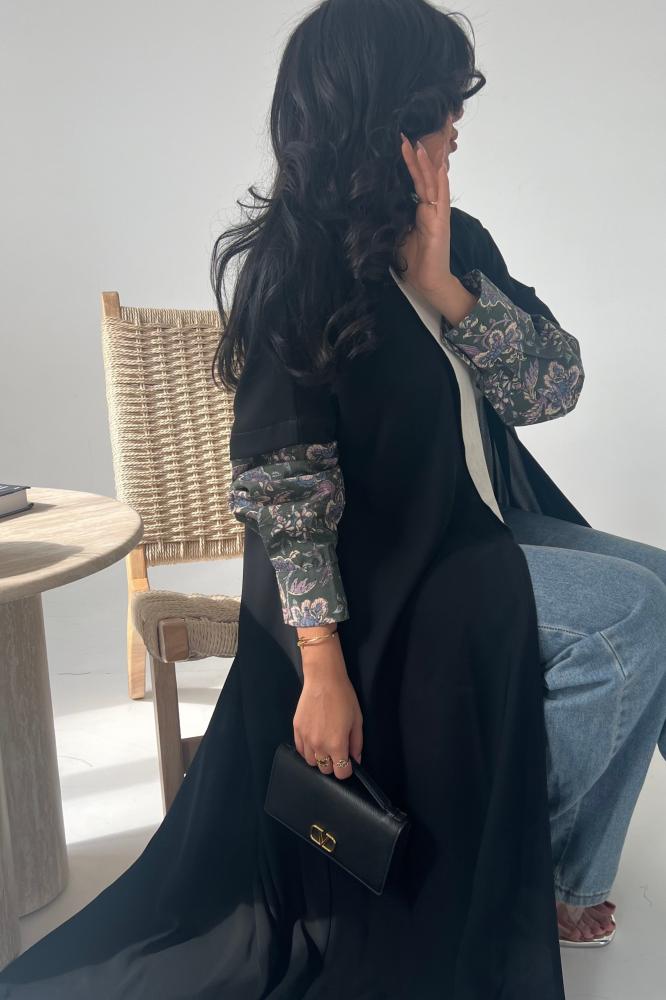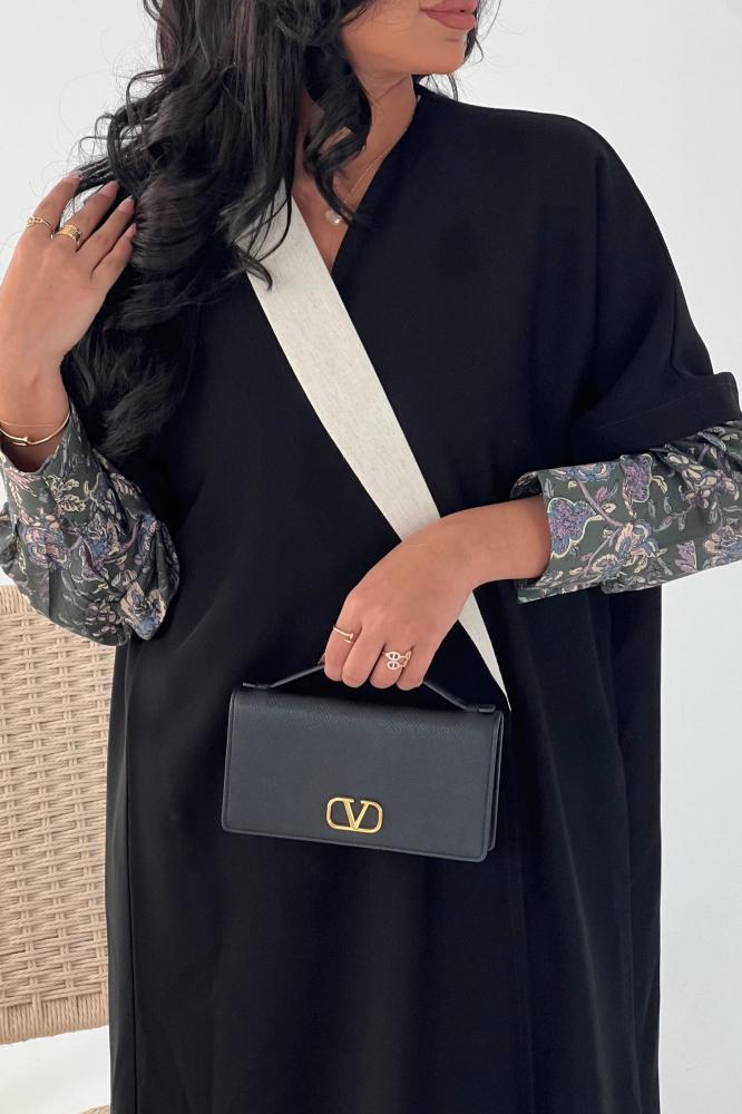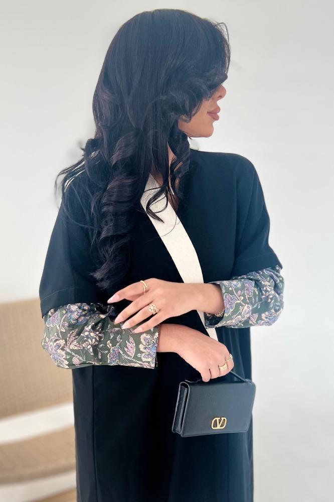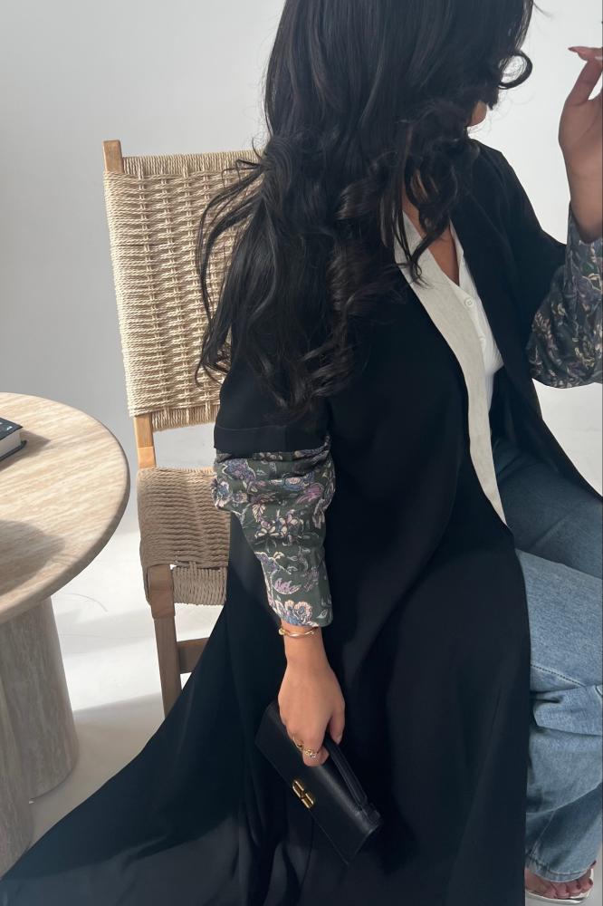 بلايزر كريب ناعم باللون الاسود ، مع ياقة قطن مورد وأكمام قطن هندي ملون وطرحة بطرف ملون