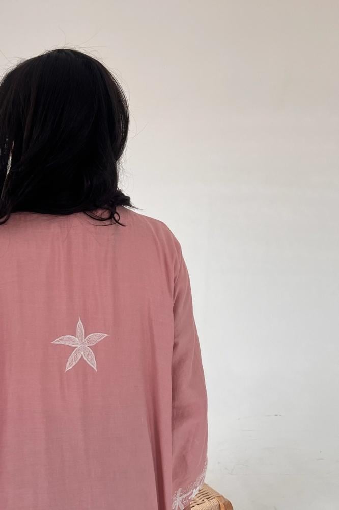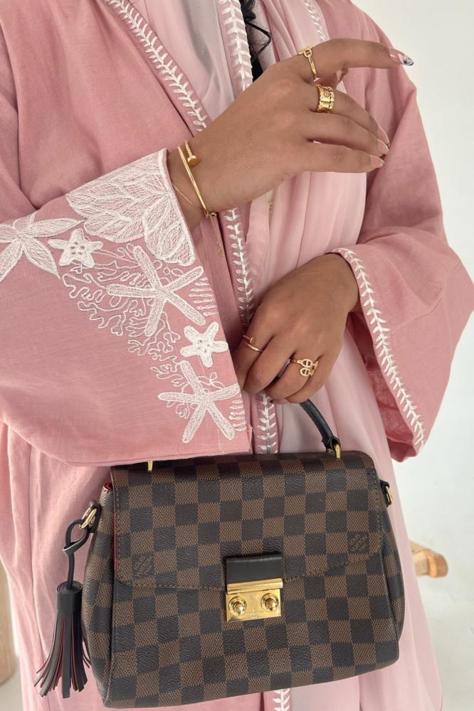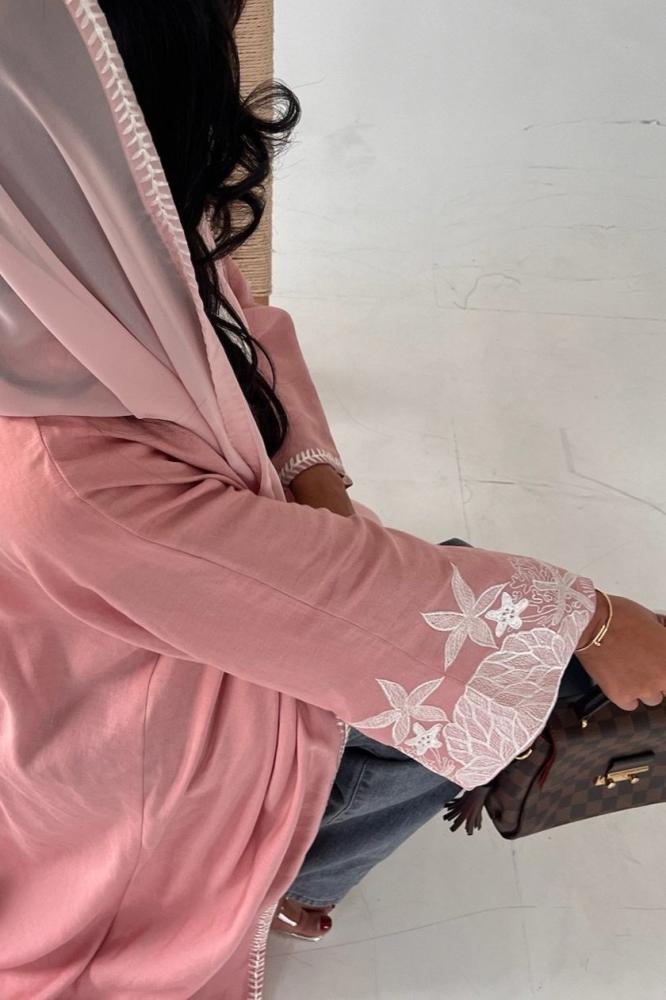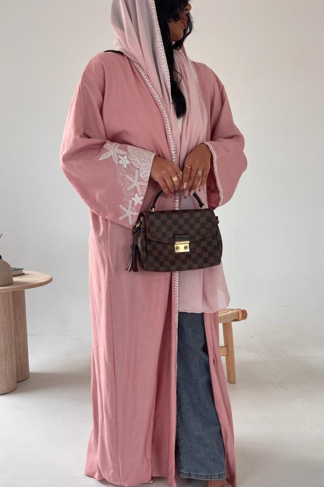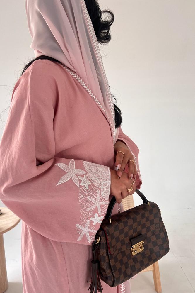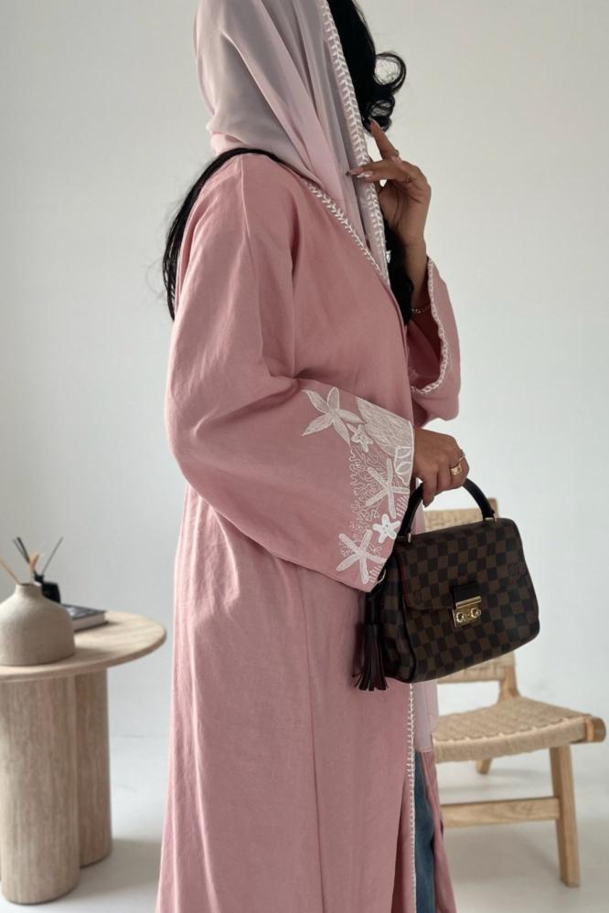 لينن فسكوز باللون الوردي مع تطريز ناعم باللون السكري للشعب المرجانية مع طرحة وردي بطرف مطرز