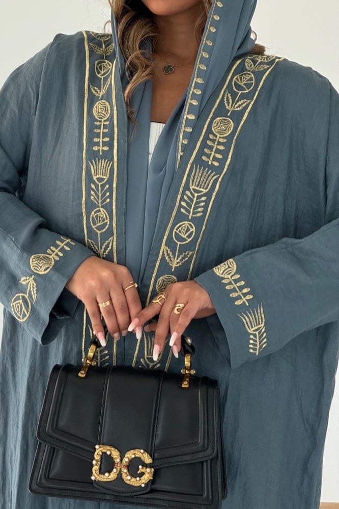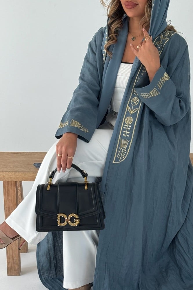 عباية لينن مغسول فاخر بتطريز ورود ذهبية مع طرحة