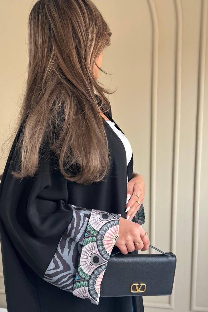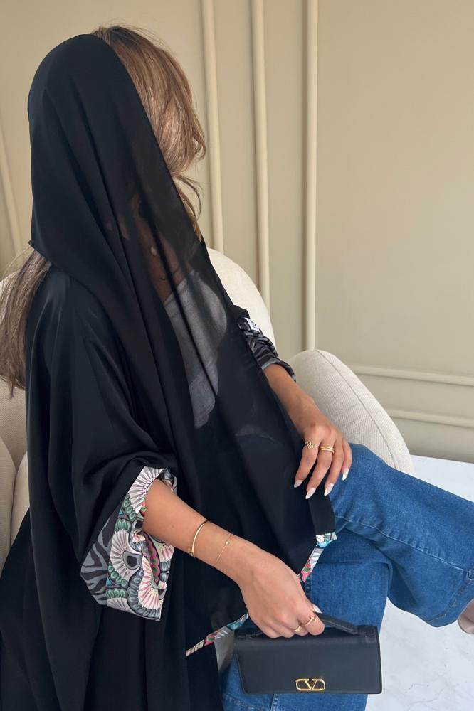 عباية كريب ناعم اسود باكمام حرير ملون ناعمة وأنيقة ، وطرحة بطرف ملون .