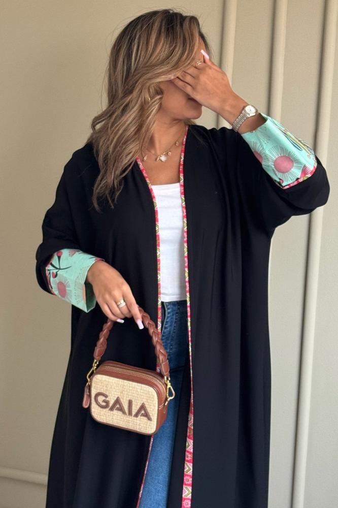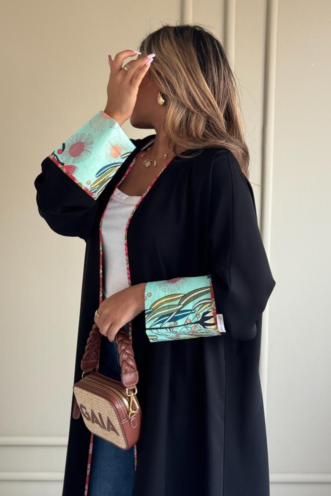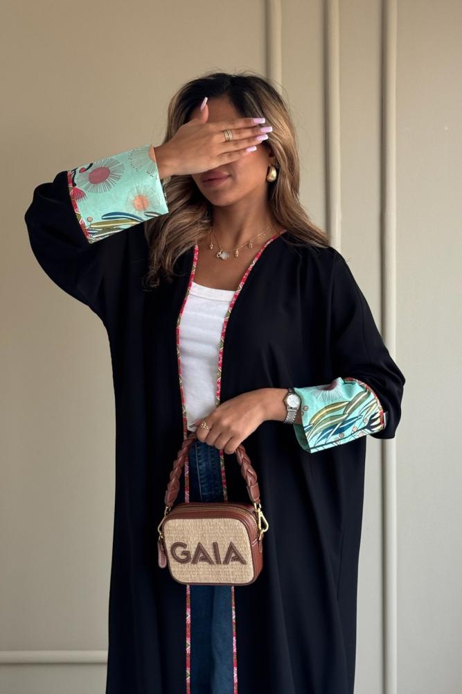 عباية كريب ناعم باللون الأسود ، مع قطن ملون وطرحة بطرف ملون