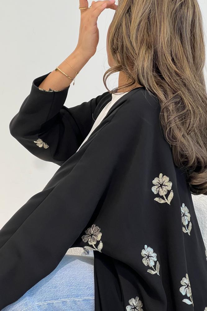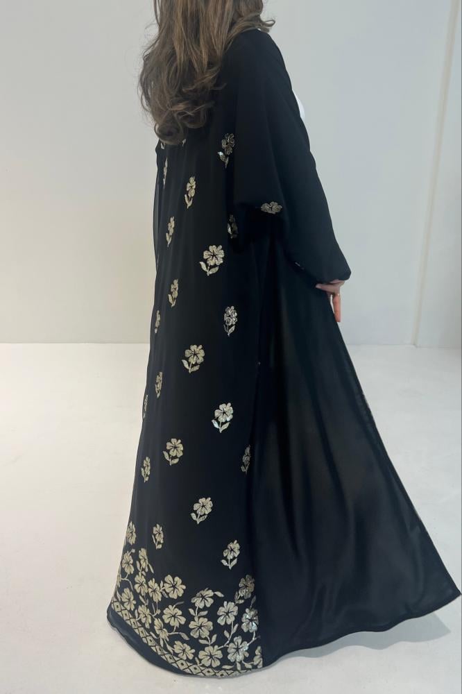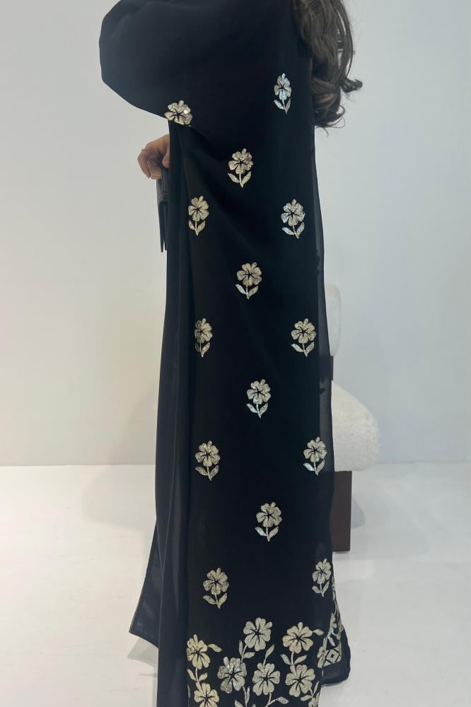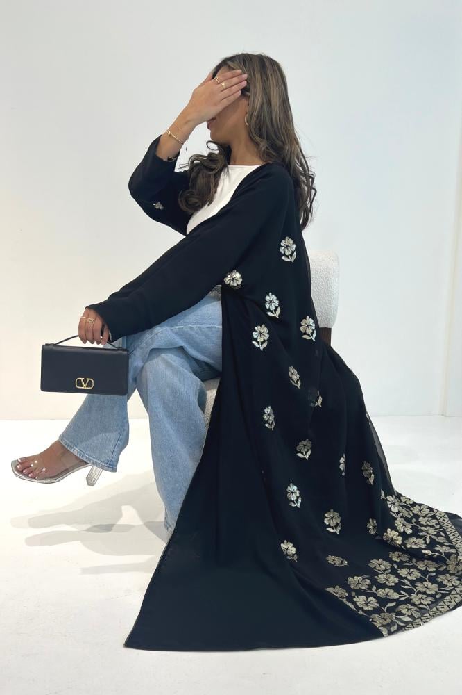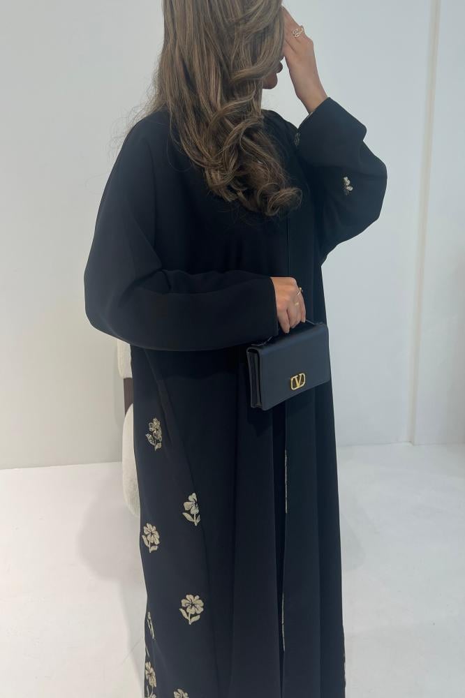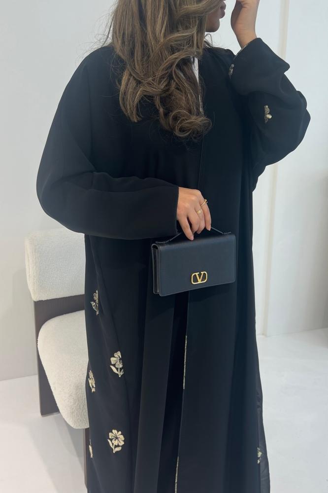 عباية كريب ناعم مع شيفون مطرز بورود ذهبية من الخلف وطرحة سودا بطرف .